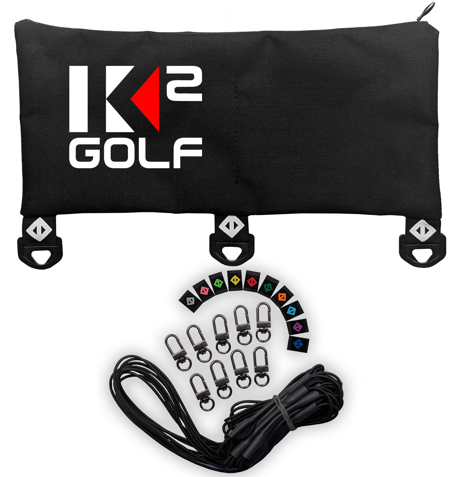 GEN 2 weighted K2 GOLF DOUBLE ANCHOR BAG. The Double Anchor Bag has 4 total connection points. The 4th is below the top zipper. ALL NEW GEN 2 Bungee Cord Pack with 8 BLACK bungee tether cords, 8 Optional Speed Clips and 8 Optional Diamond ID Sleeves to easily identity individual tees. Gen 2 cords are less prone to twisting and tangling, are much stronger with the metal sleeves eliminated.