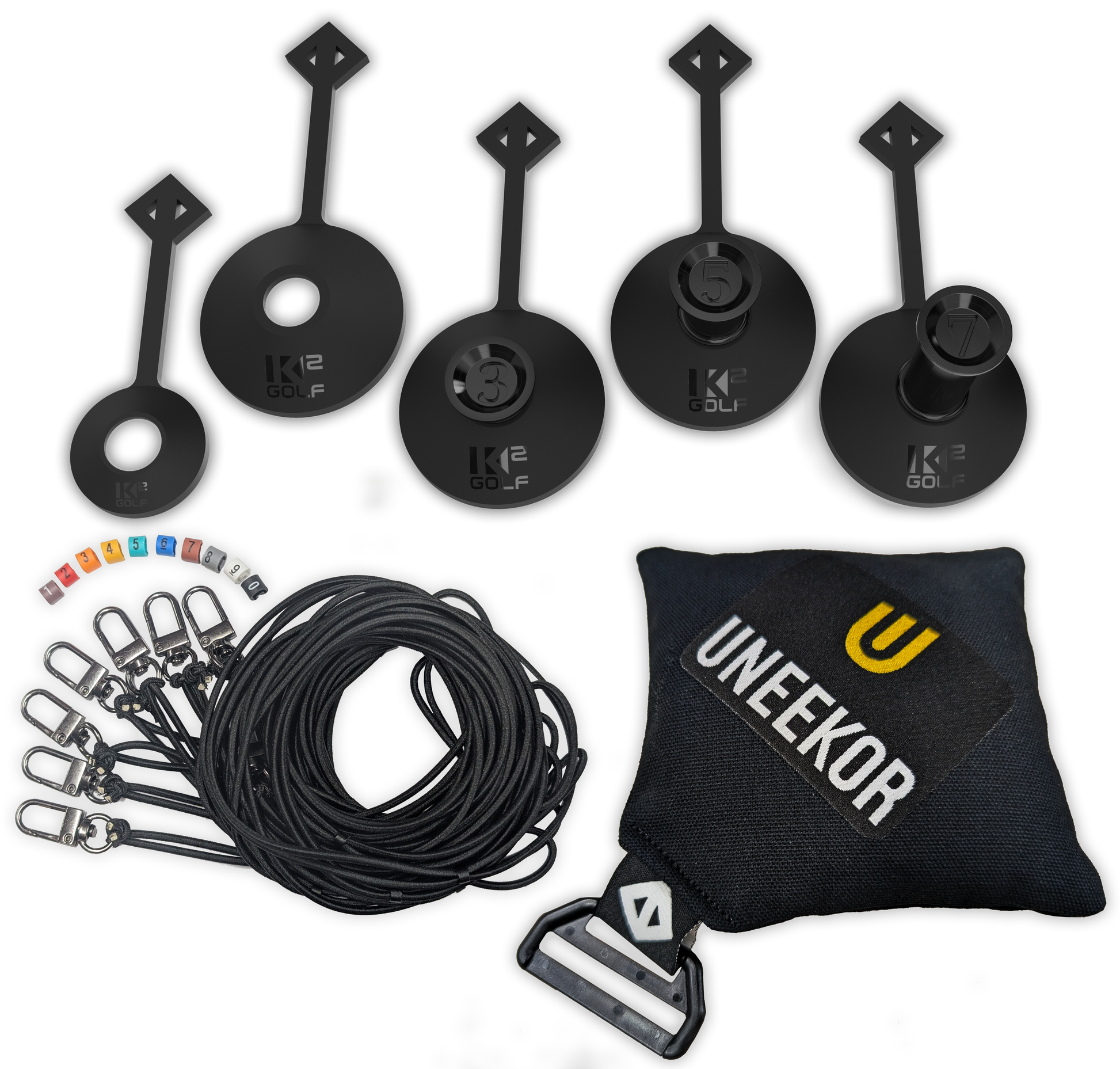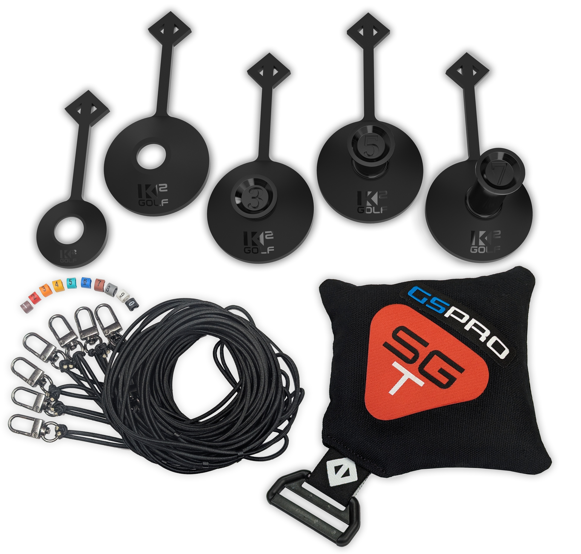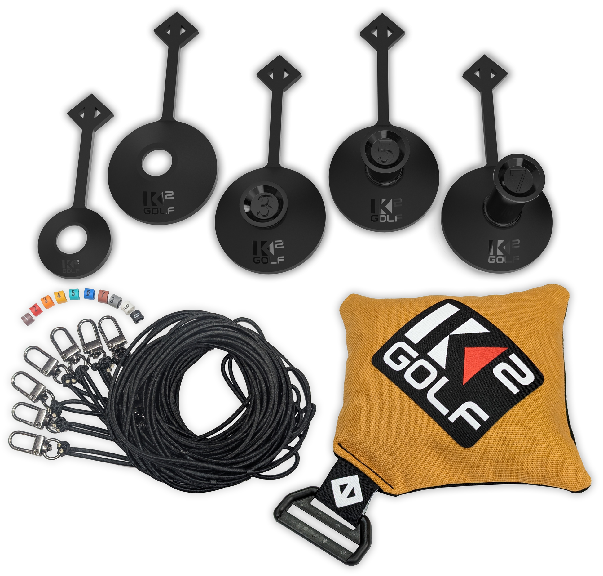1 lb. Weighted K2 GOLF bag. ALL NEW GEN 2 Bungee Cord Pack with 8 BLACK bungee tether cords, 8 Optional Speed Clips and 10 Optional colored/numbered rings to easily identity individual tees. Gen 2 cords are less prone to twisting and tangling, are much stronger with the metal sleeves eliminated.